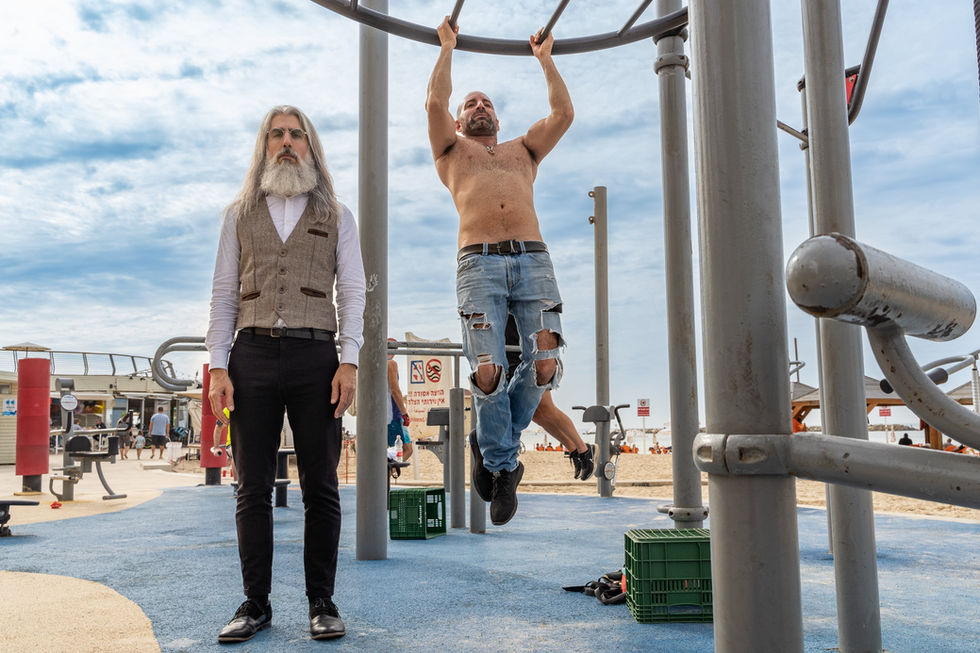 To examine this, Sharon placed Ohad in a variety of typical locations that represent life in Israel for her, this warm country home to warm people. She took photos at the sunny beach, the marketplace, at the park, running into the familiar sight of people making use of the good weather and barbequing. These locations were an entryway to meeting the Israeli people in them. Sharon remembers, “We ran into a father who coaxed his young daughter to take a picture with Ohad, into a folk dancing class; we met a man who came to the same beach every day for twenty years and fed the egrets, so now they recognize him and come to sit on his arm. We came across a couple in love at the beach, a family picnicking in the park that invited us to join them, young men working out, a religious man helping men lay phylacteries. We encountered the loud joyful sellers in the market, as well as one butcher who, even though doesn't usually agree to have his photo taken, agreed to participate and even added his own humoristic take on the photo.”